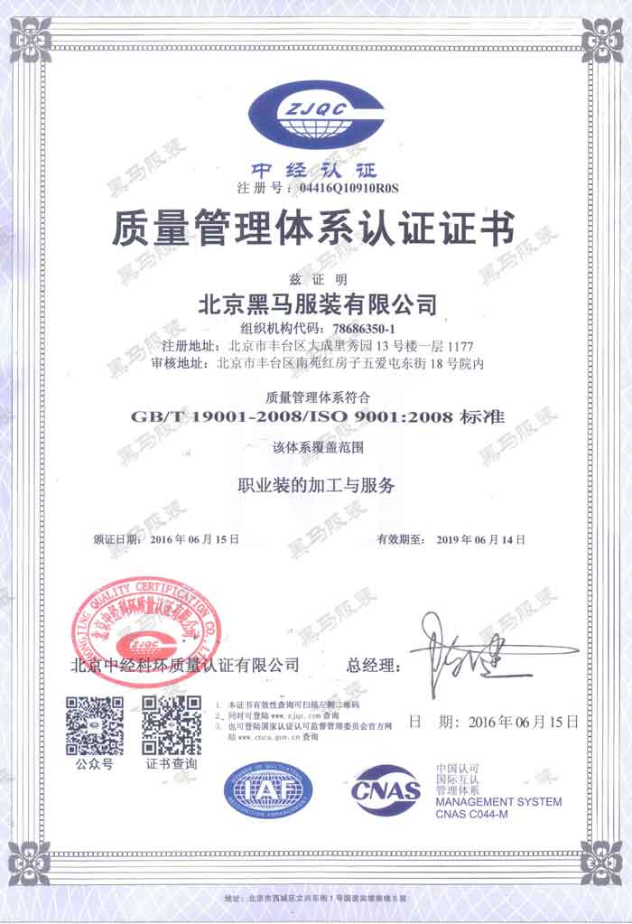 公司先后通過ISO9001國際質量管理體系認證、ISO14001國際環境管理體系認證和GB/T28001國際職業健康安全認證,是北京為數不多的全部通過三標認證的服裝生產企業。 立即咨詢