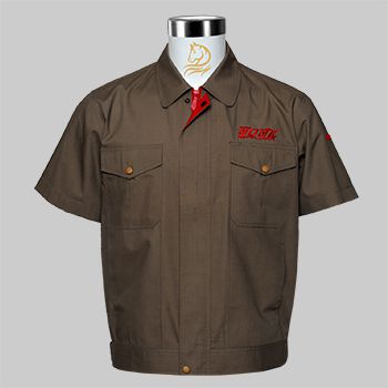 該款服裝采用可口可樂(lè)的經(jīng)典色褐色,像可口可樂(lè)飲料的顏色,暗門(mén)襟內(nèi)里搭配可口可樂(lè)LOGO的經(jīng)典紅色,體現(xiàn)出企業(yè)形象,并統(tǒng)一了視覺(jué)效果。