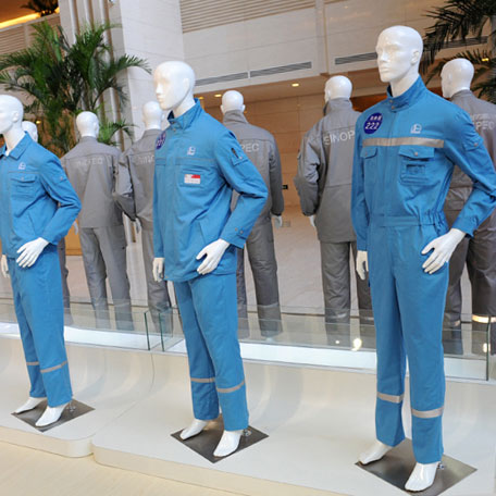 勞保服裝的主體顏色應區別于作業場所背景色,不得影響各種色光信號的正確判斷。因此,   1、油田板塊有國旗紅和橘紅色兩種,其中橘紅色用于海上作業。   2、煉化板塊采用煉化藍。   3、銷售板塊有藍色和紅黑色兩種顏色,日前樣衣正在試穿,顏色待定。   4、工程建設板塊有煙灰色和湖藍色兩種,企業自行選擇其中一色。44,42,45,76,92,94,39,121,122